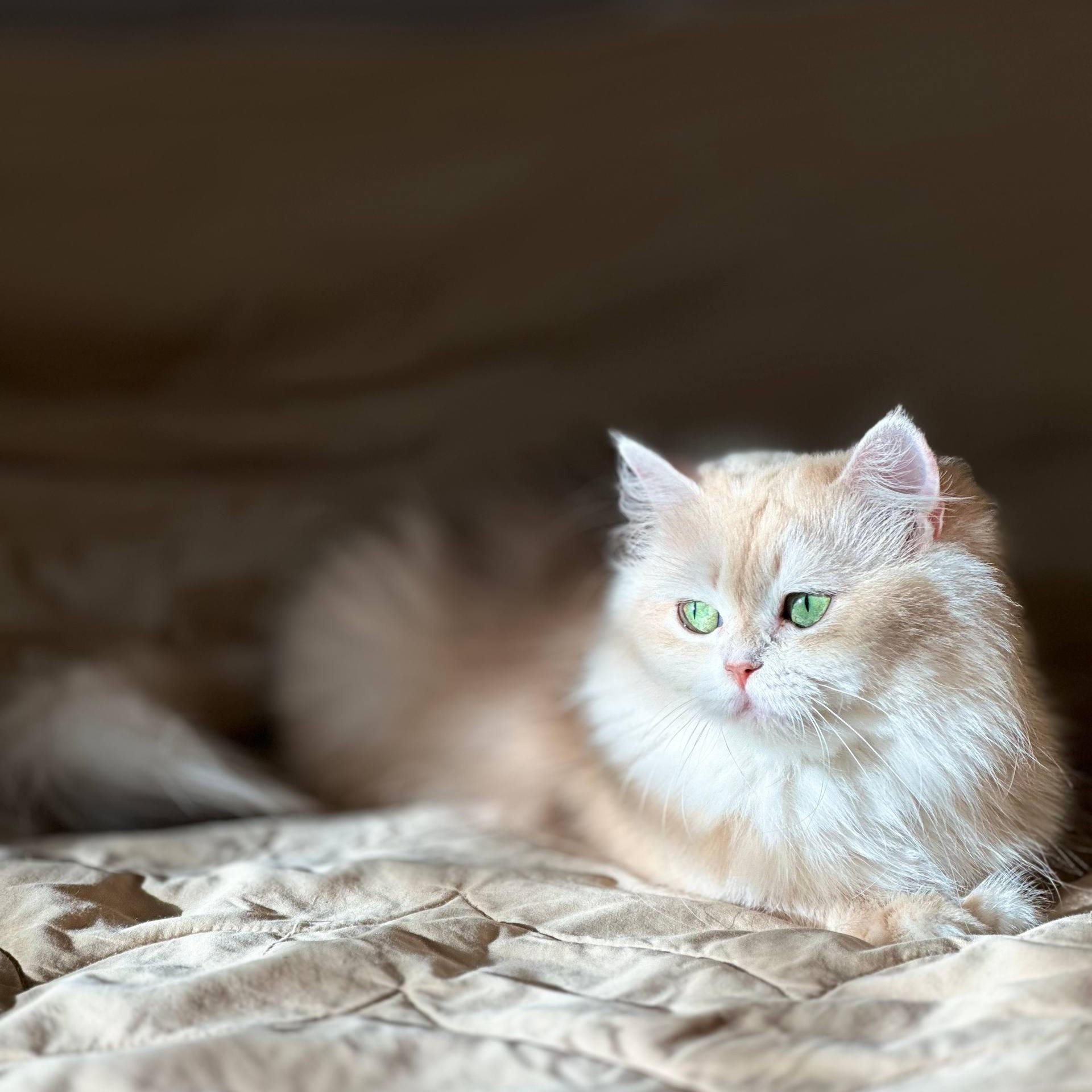 She has a soft, luxurious long coat and a very harmonious British type. Her wide ear placement and bright green eyes create a beautiful open expression that gives her a refined and memorable look.